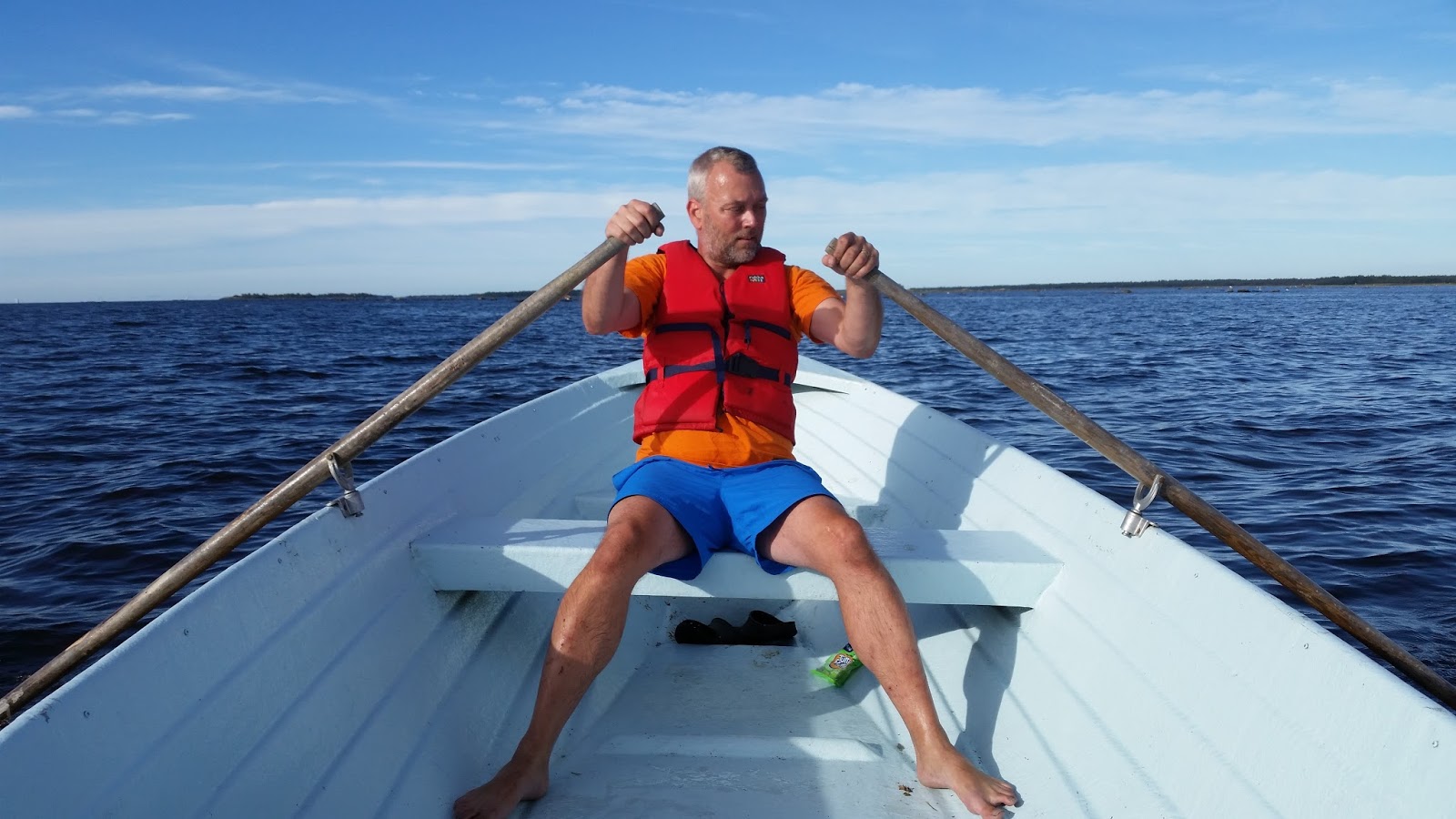 Det första Jan fick göra imorse var att dra upp båten på strand, så den inte skulle blåsa iväg.